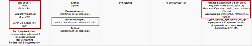 Итак, в 2016 году прокурор Владимир Комашко задекларировал лишь «здание В-1» в Чернигове. Ее владельцем является прокуратура Черниговской области, а из декларации даже не понятно, имеет ли право на пользование этим зданием прокурор или нет. Где же Владимир Комашко проживает в Чернигове — неизвестно, ведь ни собственного имущества или права пользования имуществом родственников он там не имеет.