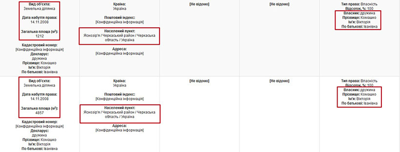 Однако больше всего вопросов к прокурору возникает по поводу его состояния. В своих декларациях за 2014, 2015 и 2016 годы Комашко указал 925 тыс. грн зарплаты и еще 312 тыс. грн дохода от продажи имущества. Его жена за это время получила 62 тыс. грн. Но несмотря на низкий доход, именно Виктория Ивановна Комашко владеет почти всем имуществом прокурорской семьи. Зато сам Владимир Владимирович не имеет в собственности почти никаких объектов недвижимости.