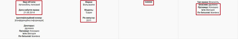 Нет в собственности прокурора Владимира Комашко и собственного авто. Среди задекларированных автомобилей есть лишь Volkswagen Touareg 2011 выпуска, принадлежащий его жене. Указанная стоимость этого авто — 148 тыс. грн, хотя рыночная цена Volkswagen Touareg 2011 г.в. сегодня — ок. 750 тыс. грн.