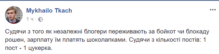 "Судя по тому как независимые блогеры переживают за бойкот или блокаду рошен, зарплату им платят Шоколапки. Судя по количеству постов: 1 пост - 1 конфета", - написал Ткач в Facebook.