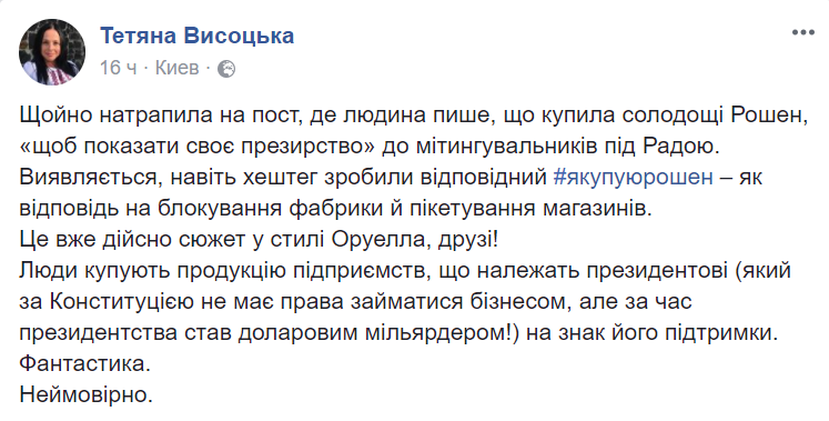 "Только что наткнулась на пост, где человек пишет, что купила сладости Рошен, "чтобы показать свое презрение" к митингующим под Радой. Оказывается, даже хэштег сделали соответствующий # якупуюрошен - как ответ на блокирование фабрики и пикетирование магазинов.