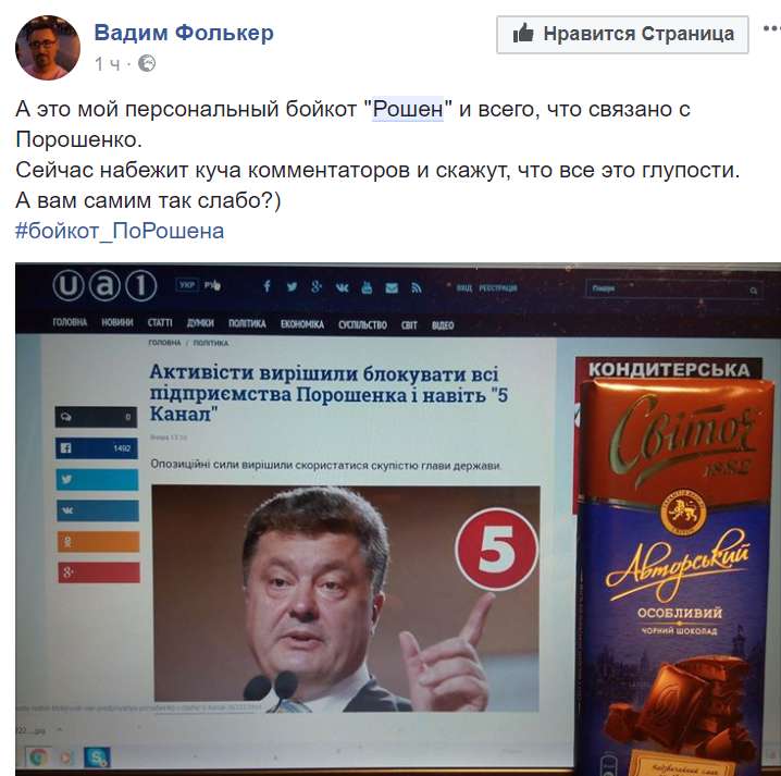 Журналист Вадим Фолькер показал свой персональный бойкот "Рошена", выложив фото шоколадки другого производителя.
