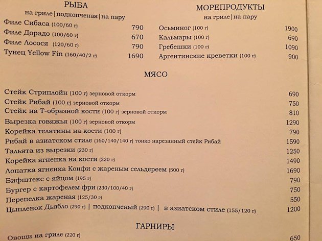 Сфотографировал пару секций из обширного меню. Давайте все вместе подсчитаем, сколько стейков Рибай уместится в одну среднюю ежемесячную российскую зарплату. Давайте проведём одно простое арифметическое действие, чтобы узнать, сколько раз за месяц средний российский пенсионер сможет позволить себе обыкновенную закуску перед главным блюдом – Insalata Caprese, моцареллу с помидорами, да чтобы ещё осталось что-то на оплату квартиры и услуги ЖКХ. Помним, что цены на некоторые наименования даны за 100 грамм.