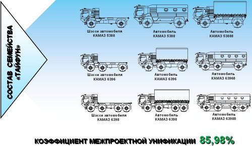 В семействе "Тайфун" предусмотрено сразу несколько вариантов исполнений: 4х4, 6х6, 8х8. УралАЗ традиционно будет выпускать капотные версии, а КАМАЗ- бескапотники. Вариант Урал-63095 рассчитан на перевозку 16 бойцов в бронекапсуле и 3 членов экипажа. Такой автомобиль имеет полную массу 22,5 т и способен еще буксировать прицеп на 8 т. Автомобиль имеет дорожный просвет 400 мм и способен форсировать брод глубиной до 1,75 м или ров шириной до 0,6 м. Ведущие мосты разрезного типа, с центральным и колесным редукторами и блокировкой межколесных дифференциалов.