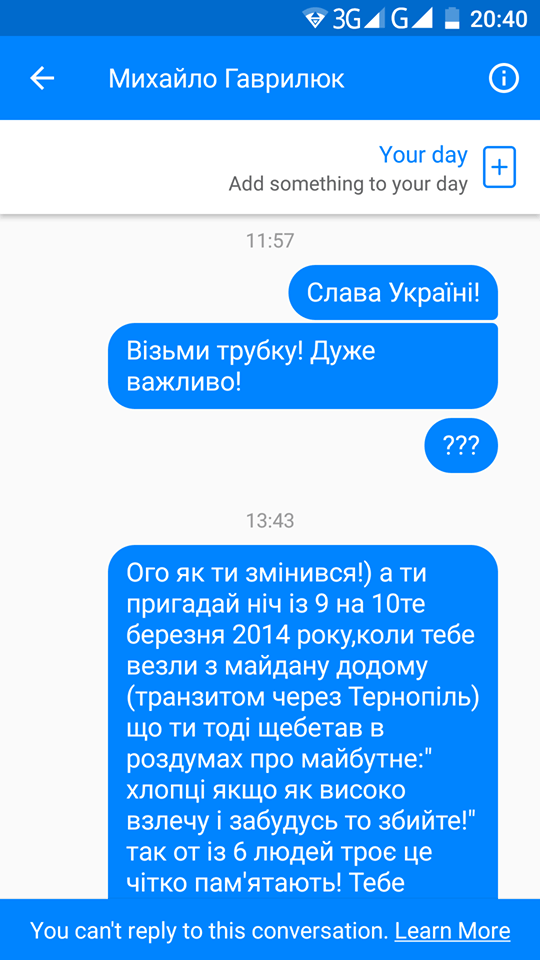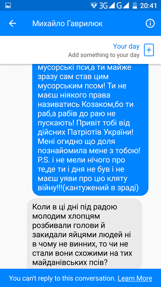 Довго спілкуватись з Гаврилюком Олександр не зміг. Огидно було чути від нього про зміни і реформи, як і про те, що ніяких активістів під Радою не має, а всі ті люди – проплачене збіговисько. А в смс-переписці Гаврилюк назвав псами тих протестувальників, котрі під Радою закидали яйцями екс-регіонала Олексія Гончаренка та посіпаку Порошенка Олега Барну.