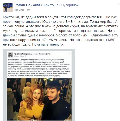 Выбор победителей тендера (в том числе – та самая фирма приятеля Авакова-младшего) произошел при личном вмешательстве бывшего заместителя Министра внутренних дел Сергея Чеботаря. В феврале этого года появилось видео со скрытой камеры, на котором сын министра внутренних дел, вероятно, договаривался с Чеботарем о поставке рюкзаков для подразделений министерства.