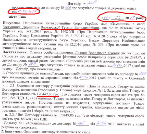 У цій ситуації НАБУ робить нестандартний крок. Майже одразу підписується додаткова угода з постачальником. 10 квітня – основна, 11 квітня – додаткова.