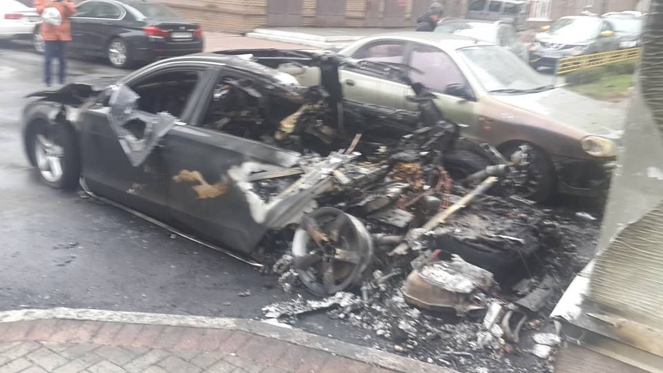 В результаті вибуху практично знищена задня частина авто. Легкі пошкодження отримали ще два авто, які стояли поруч.
