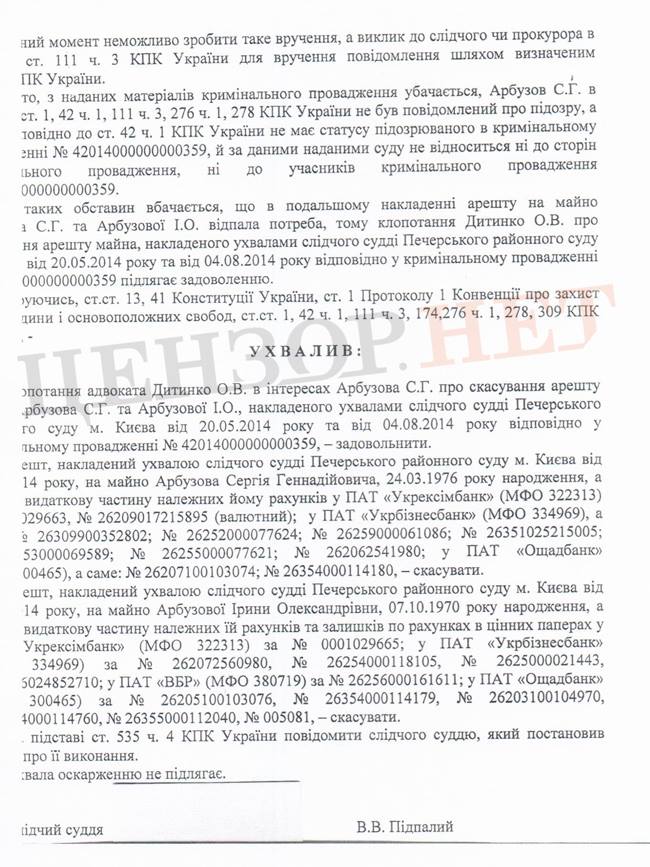 Редактор "Цензор.НЕТ" Юрий Бутусов опубликовал копии решения Печерского суда о возвращении экс-вице-премьеру Сергею Арбузову восьми банковских счетов.