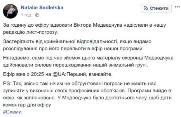 "За годину до ефіру адвокати Віктора Медведчука надіслали в нашу редакцію лист-погрозу. Застерігають від кримінальної відповідальності, якщо видамо розслідування про його перельоти в ефір нашої програми. Нагадаємо, саме під час зйомок цього матеріалу охоронці Медведчука здійснювали силове перешкоджання нашій знімальній групі", - написала журналіст.