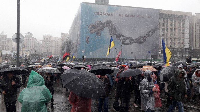 Как сообщает Украинская правда, на площади собралось несколько сотен человек с флагами Украины и «Правого сектора».