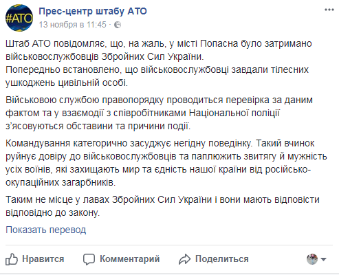 В свою очередь в штабе антитеррористической операции никаких комментариев по поводу происшествия предоставить не смогли. Представитель пресс-центра отметил лишь, что 13 ноября 2017 года штаб АТО сообщал о задержании в Попасной военнослужащих ВСУ, которые "нанесли телесные повреждения гражданскому лицу".