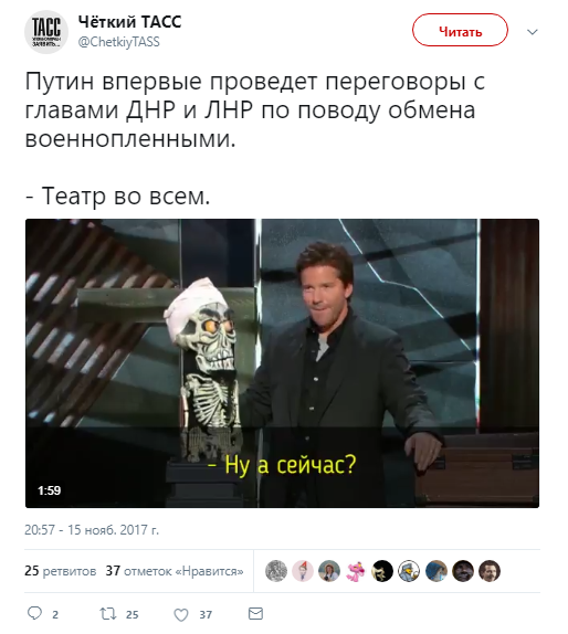 "Кукольный театр", "На тему "гражданской" войны в Украине", "Театр во всем", "Сам с собою пообщался", "А Мугабе на кого обменяют?", "Какой же театр? На полном серьезе пропиарил Медведчука и себя любимого. Ну и типа напомнил Западу про кузькину мать ("ЛДНР") у себя под столом, которую он в любой момент может спустить с цепи", - пишут в интернете.
