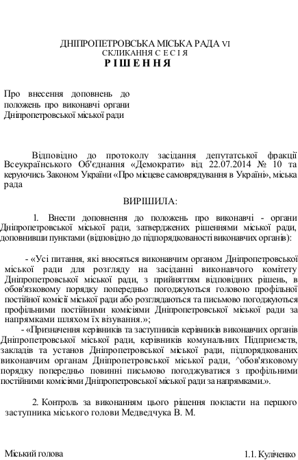 - «Призначення керівників та заступників керівників виконавчих органів Дніпропетровської міської ради, керівників комунальних Підприємств, закладів та установ Дніпропетровської міської ради, підпорядкованих виконавчим органам Дніпропетровської міської ради, Обов’язковому порядку попередньо повинні письмово погоджуватися з профільними постійними комісіями Дніпропетровської міської ради за напрямками.».