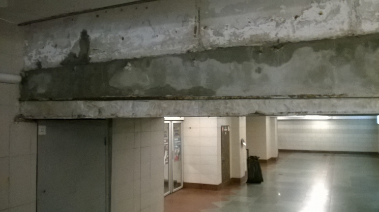 На потолке одного из вестибюлей станции отчетливо видны разводы от протекания. Также в плохом состоянии находится потолок подземного перехода, который ведет к станции: от влаги белый потолок становится серым, от него уже отваливается штукатурка.