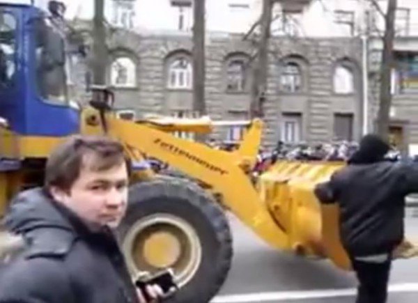 На самом деле, все было так. Собственник грейдера куда-то не туда свернул и оказался на Институтской, рядом с Банковой. Толпа не дала ему двигаться. Он заглушил мотор. И позже сам научил какого-то парня в балаклаве управлять грейдером. Что же касается меня, то я просто снимал все на камеру. В том числе, стоял с камерой на едущем грейдере.