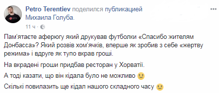 "Пам’ятаєте Олейникова? Він на вкрадені у довірливих дурників гроші відкрив ресторан у Хорватії", - пише Голуб. "Розвів хом’ячків вперше, коли зробив із себе "жертву режиму" і вдруге, коли тупо вкрав гроші. На вкрадені гроші придбав ресторан у Хорватії. А тоді довести, що він кидала було неможливо. Скільки ще вилізе кидал у наш складний час", - зазначив журналіст Петро Терентьєв.