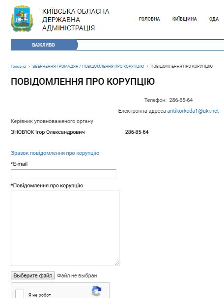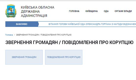 - незабезпечення можливості внесення повідомлень про корупцію через офіційний веб-сайт Київської обласної державної адміністрації,