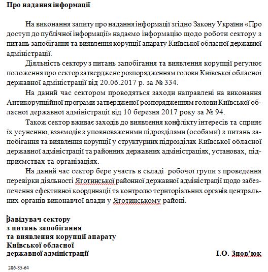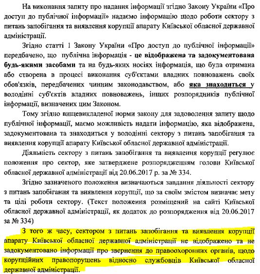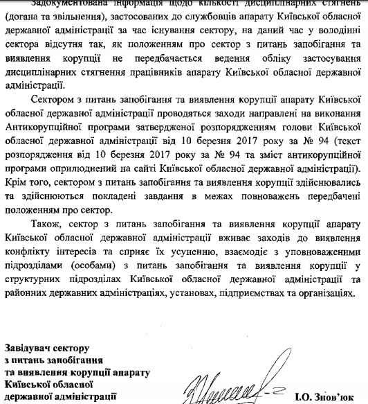 Так, у відповіді за підписом Ігора Знов`юка, завідувача сектору з питань запобігання та виявлення корупції апарату КОДА, замість перерахування конкретних заходів йдеться про те, що «на даний час сектором проводяться заходи, направлені на виконання Антикорупційної програми, затвердженої розпорядженням голови Київської обласної державної адміністрації від 10 березня 2017 року за № 94.
