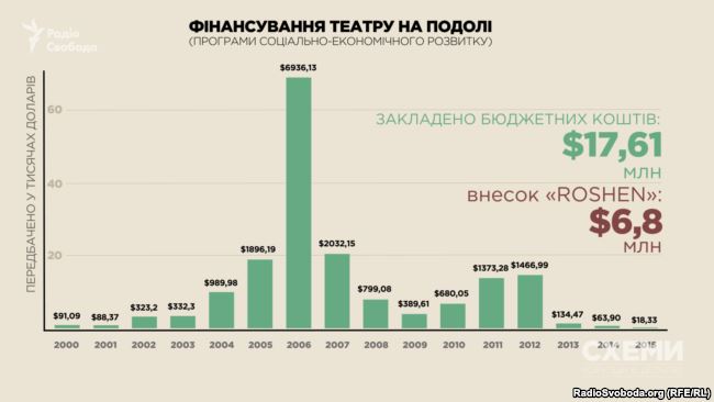 На протяжении 15 лет на реконструкцию театра в бюджете закладывались разные суммы. Меньше в 2014 году - 434,6 тыс. гривен, всего в 2006 г. – 35 млн. Общая сумма с 2000 по 2015 годы составляет 103,75 млн гривен. А это всего на треть меньше 174 млн заявленного взноса “Рошен”.