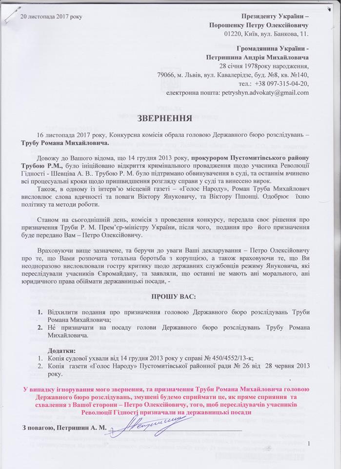 А відтак, з врахуванням вищезазначеного, відсилаю Президенту листа з прямими доказами про те, що Труба Р. М. є посіпакою режиму януковича-пшонки, і що саме він переслідував активістів євромайдану, а тому, як раніше декларував Порошенко, такі люди немають права обіймати державницькі посади.