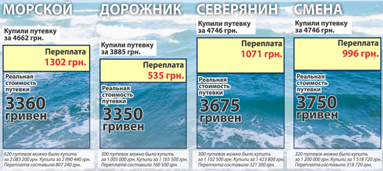 “У” Дорожника “путевки были куплены по 3885 грн, у” Морского “- по 4662 грн, у” Северянина “и” Смены”- по 4746 грн”, – говорит, сверяясь с документами, начальник управления центральной дирекции фонда Тарас Антоненко.