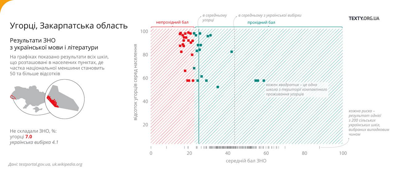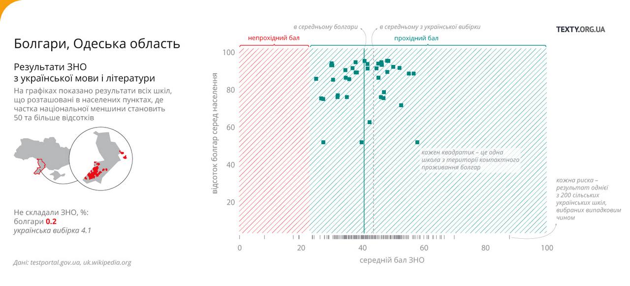 42% угорських дітей не складають цей тест взагалі, румуни йдуть на нього, але, як і угорці, мають погані результати. Болгари ж складають ЗНО на загальноукраїнському рівні.