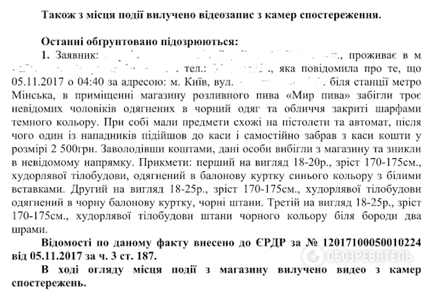 Так, первый разбой произошел 5 ноября, около 4:40 в магазине "Мир пива" возле метро "Минская". Как сообщил заявитель, в помещение забежали трое неизвестных мужчин, одетых в черную одежду, их лица были закрыты шарфами темного цвета. При себе имели предметы, похожие на пистолеты и автомат, после чего один из нападавших подошел к кассе и самостоятельно забрал из кассы денежные средства в размере 2500 грн.
