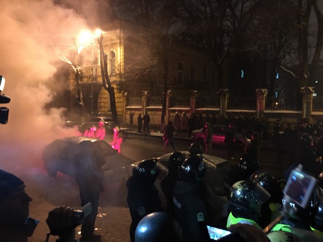 Протестувальники кинули декілька фаєрів та димових шашок в бік поліції.