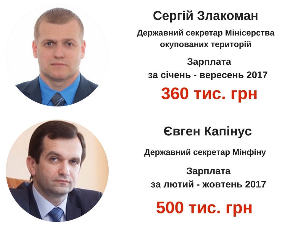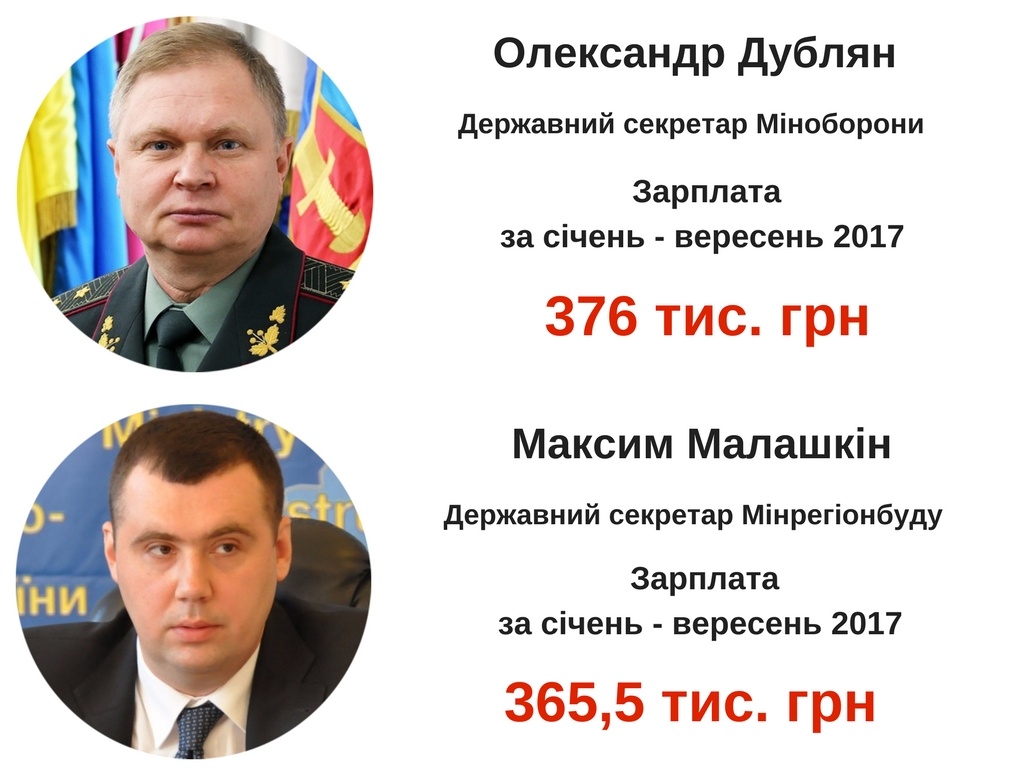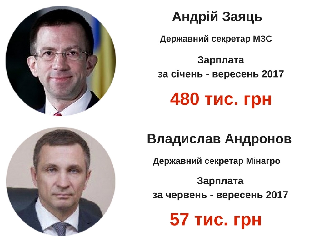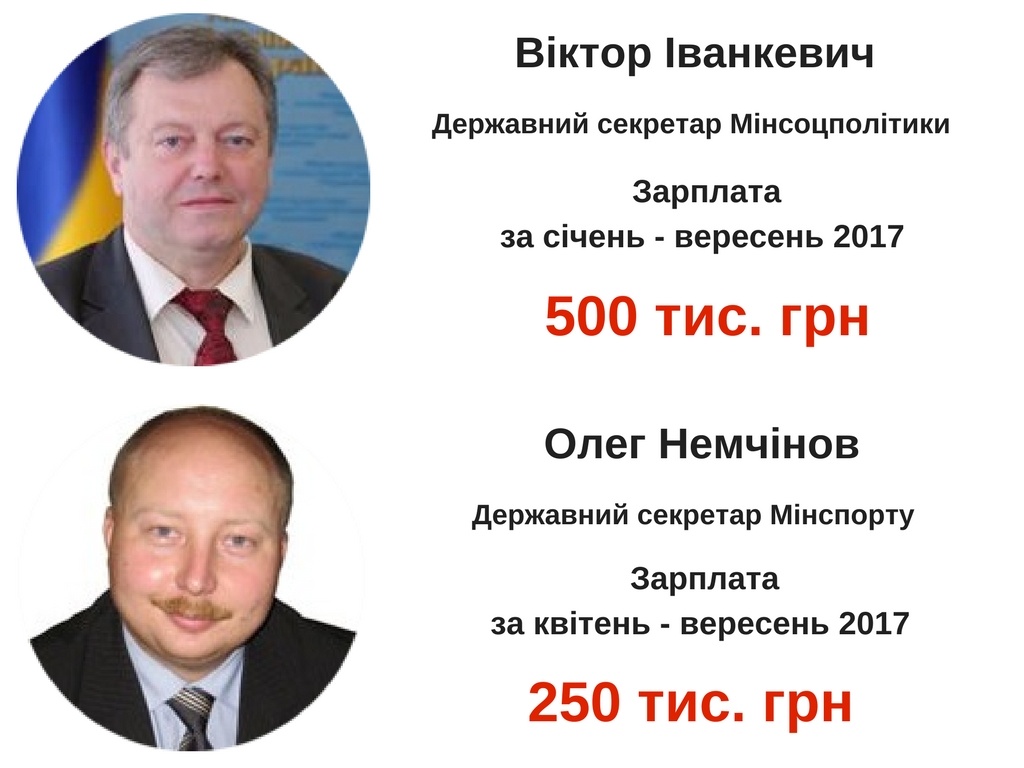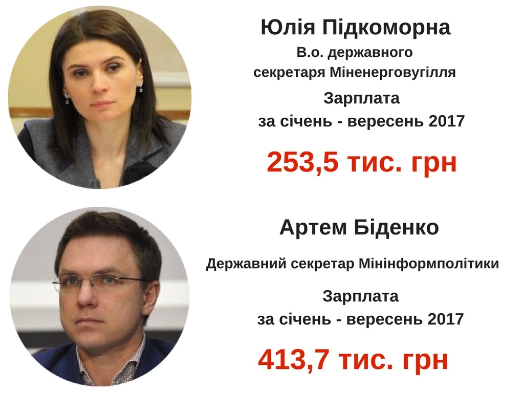 В цілому, саме посадові оклади у державних секретарів доволі невеликі — до 13 тис грн. Проте за рахунок різного роду надбавок (за ранг, за вислугу років, за інтенсивність праці, за виконання особливо важливої роботи, за роботу з таємними документами і т.д.), премій та іншого роду доплат чиновникам вдається виходити на більш суттєві суми — в тому числі, більше 100 тис грн на місяць.