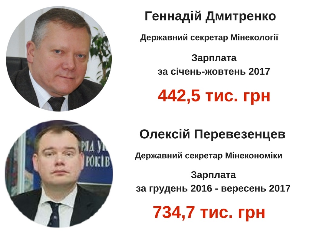 За даними відомств, найбільшу суму нарахувань за час роботи на посаді держсекретаря було здійснено державному секретарю Мінекономіки Олексію Перевезенцеву за період часу з грудня минулого року по вересень 2017 року (без даних за жовтень. — «Главком»).