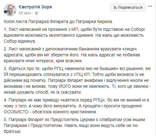Пресс-секретарь УПЦ КП Евстратий Зоря опубликовал в Facebook текст письма патриарха Филарета патриарху Кириллу и епископату РПЦ.