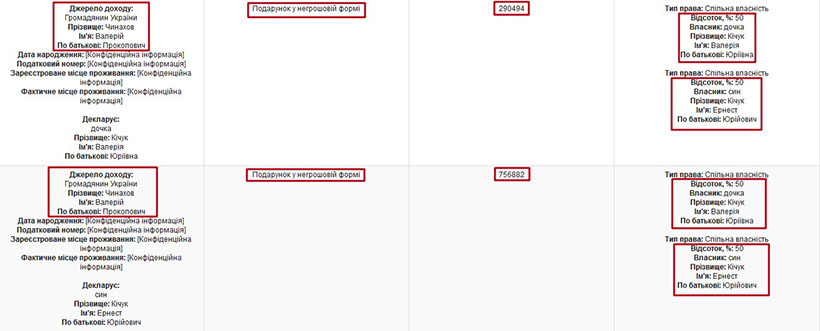 В 2015 году дети супругов - в то время 5-летний Эрнест Кичук и 11-летняя Валерия Кичук - получили подарок в неденежной форме стоимостью 1 млн грн. Получили подарок они от Валерия Прокоповича Чинахова - отца Виктории Кичук. При этом никакого бизнеса, зарегистрированного на тестя прокурора, который мог бы объяснить столь ценные подарки - мы не нашли.