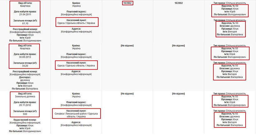 Сами же Юрий и Виктория Кичук также имеют достаточно недвижимости. Квартира площадью 61 кв. м. расположена в Одессе по адресу ул. Черниговская, 9-В. Сегодня стоимость подобной квартиры составляет почти 74 тыс. долларов. Хотя в декларации указана цена только 163 тыс. грн. Другая квартира площадью 34 кв. м. расположена по адресу г. Одесса, улица Академика Вильямса, 77. Вместо расположения земельного участка нам узнать не удалось.