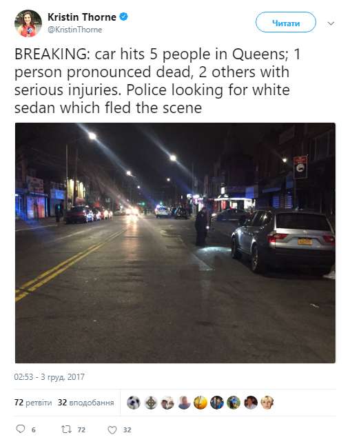 В воскресенье, 3 декабря, в Нью-Йорке (США) автомобиль врезался в толпу людей, в результате чего погиб один человек, трое получили ранения.