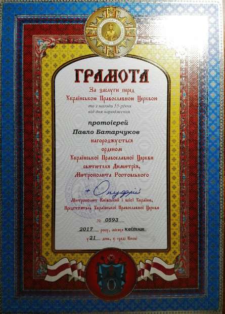 За все свои усердные труды во благо Церкви в апреле этого года был награждён орденом святителя Димитрия Ростовского (фото взято со страницы храма вконтакте ).