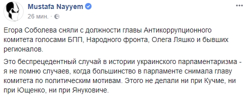 «Егора Соболева сняли с должности главы Антикоррупционного комитета голосами БПП, Народного фронта, Олега Ляшко и бывших регионалов. Это беспрецедентный случай в истории украинского парламентаризма — я не помню случаев, когда большинство в парламенте снимало главу комитета по политическим мотивам. Этого не делали ни при Кучме, ни при Ющенко, ни при Януковиче. Это не просто увольнение главы комитета. Это прямое вмешательство президента в работу парламента. Мне достоверно точно известно, что требование об увольнении Егора Соболева исходит лично от Петра Порошенко. Фракции, голосовавшие за это увольнение стали инструментом брутального вмешательства главы государства в работу парламента. Каждый раз, когда вы будете слышать об узурпации власти в стране со стороны президента, напоминайте им это голосование — Оппозиционному блоку, Радикальной партии и лично Олегу Ляшко, «фронтовикам» и бывшим регионалам из «Воли народа» и «Видродження», — отмечает народный депутат Мустафа Найем.