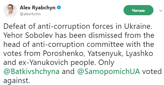«Поражение антикоррупционных сил в Украине. Егор Соболев был уволен с поста главы комитета по борьбе с коррупцией голосами от людей Порошенко, Яценюка, Ляшко и бывших сторонников Януковича. Только «Баткивщина» и «Самопомич» проголосовали против«, — констатирует нардеп Алексей Рябчин.