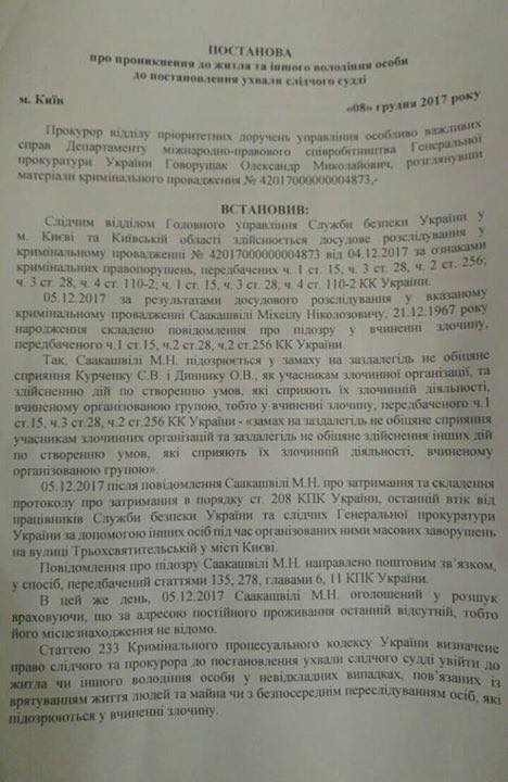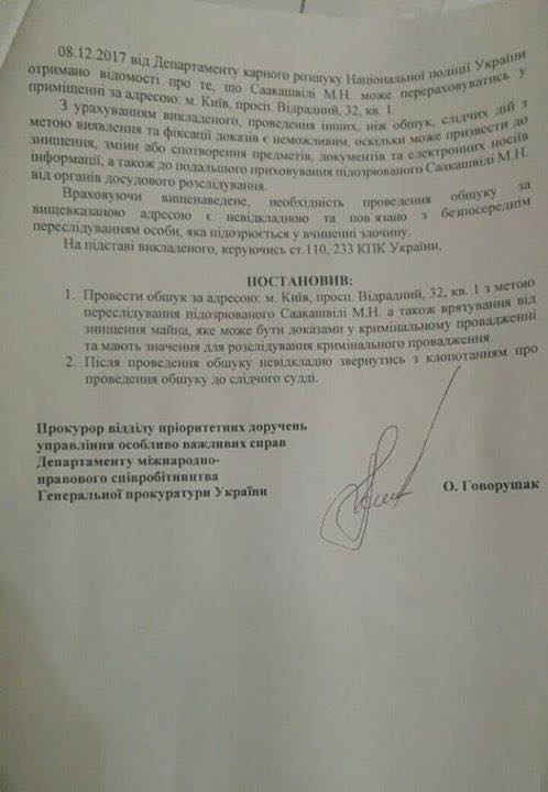 Появились фото постановления следователя Генпрокуратуры о преследовании Саакашвили с целью задержания, а также обыска жилья, где он находился.
