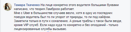 "На лице конкретно этого водителя большими буквами написано, что теория Ламброзо работает. Мне с Uber в большинстве случаев везло, хотя в одну из последних поездок водитель был то ли упорот от природы, то ли под кайфом. Заметила только в пути к сожалению. А разные траблы с такси были везде, кроме VIP служб. Если надо куда-то конкретно и без опозданий - только лицензированные службы вызываю", – поделилась Тамара Ткаченко.