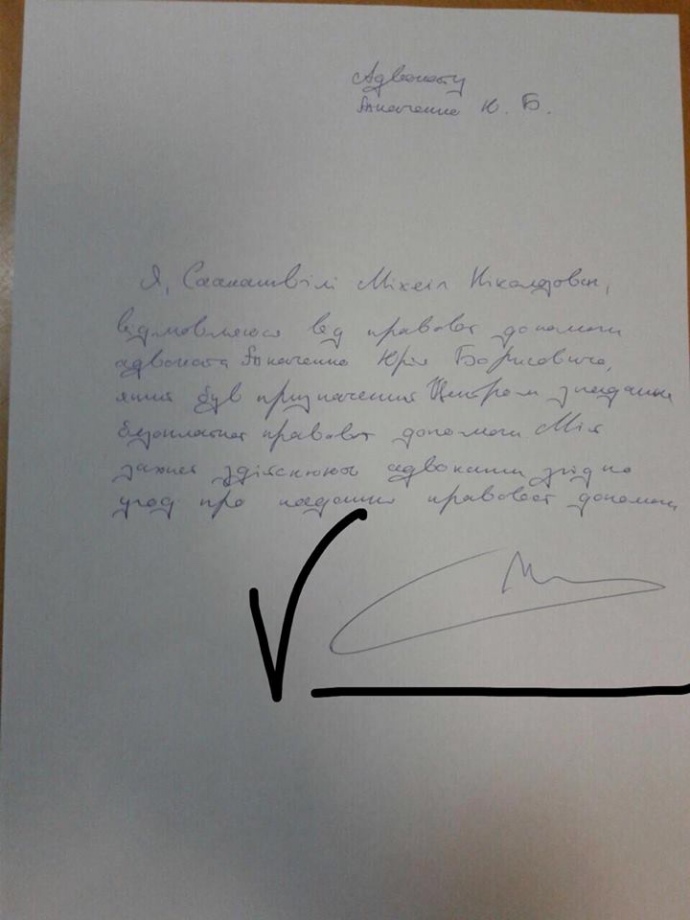 «Второй документ (заявление об отказе от адвоката, предоставленного Центром бесплатной правовой помощи) был написан моей коллегой, которая помогала оформлять документы, и текст заявления был написан ею, а подписан Саакашвили — в присутствии двух прокуроров и трех представителей ИТТ, в т.ч. начальника», — пояснил Чернолуцкий.