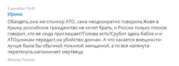 "Обалдеть, она же-спонсор АТО, сама неоднократно говорила. Живя в Крыму, российское гражданство не хочет брать, о России только плохое говорит, кто ее сюда приглашает?" - свирепствуют поклонники "русского мира".