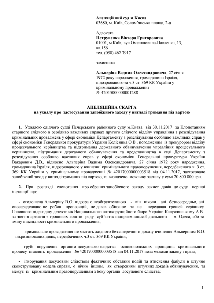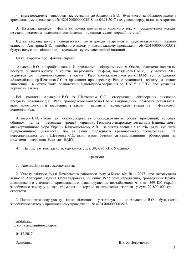 Судя по апелляции, подготовленной защитой бизнесмена, само знакомство с помощником по фамилии Шевченко Альперин не отрицает. Только вот факт предложения взятки не признает.