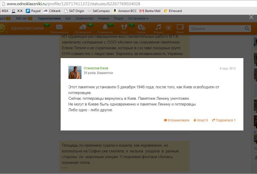 Отмечается, что Ежов не только открыто озвучивал свою позицию, но и писал соответствующие сообщения в соцсетях. Так, например, Вадим Лабас, руководитель аналитического отдела ОО "Оберег", опубликовал серию скриншотов сообщений и фотографий из социального профиля Ежова, которыми он делился во время Евромайдана.