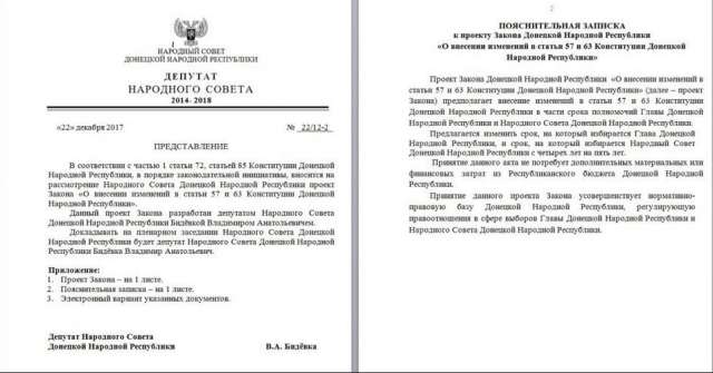 По мнению Ходаковского, фактически это означает, что в «ДНР» намерены изменить «Конституцию», чтобы Захарченко остался еще на год. При этом в качестве доказательства он опубликовал представление одного из «депутатов» о том, что целесообразно внести изменения в «Конституцию» по поводу продления полномочий Захарченко и «Народного Совета» не на 4, а на 5 лет.
