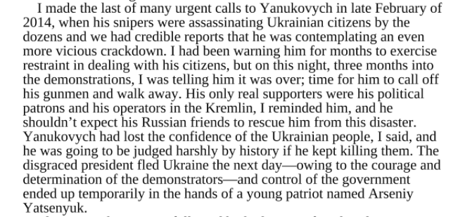 «Я сделал последний из многих срочных звонков Януковичу в конце февраля 2014 года, когда его снайперы убивали украинских граждан десятками и у нас были достоверные сведения о том, что он готовит еще более жесткий разгон. Я несколько месяцев обращал его внимание на то, что он должен проявлять сдержанность в отношениях со своими гражданами, но в ту ночь, спустя три месяца после начала протестов, я сказал ему, что все кончено. Пришло время отзывать своих боевиков, и он ушел. Я напомнил ему, что его единственными реальными сторонниками были политические покровители и манипуляторы в Кремле и что ему не стоит ожидать, что русские друзья спасут его от этой катастрофы. Я отметил, что Янукович потерял доверие украинского народа и что история жестоко накажет его, если он будет продолжать убивать людей. Униженный, Янукович бежал с Украины на следующий день — благодаря мужеству и решимости протестующих, — и контроль над государством временно оказался в руках молодого патриота по имени Арсений Яценюк».