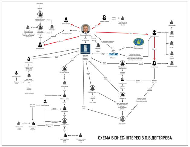 Судите сами: среди акционеров этого банка - жена Дегтярева Елена, невестка Ольга и Александр Конюхов, сын Станислава Конюхова, который настоял, чтобы именно Дегтярев сменил его на посту председателя наблюдательного совета банка «Новый». К тому же - сын самого Дегтярева Максим - главный конструктор и руководитель системного машиностроения и сайтов в КБ «Южное» и акционер трех компаний, которые через третьих лиц являются акционерами ... банка «Новий». (Подробно о бизнес-связи семьи Дегтяревым в схеме - оригинал).