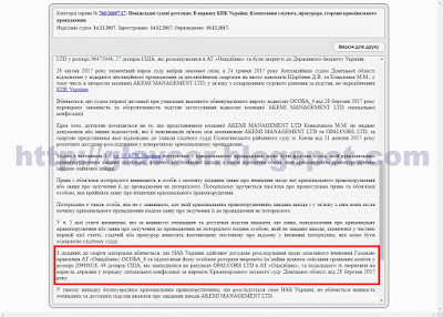 "Из приложенных к жалобе материалов усматривается, что НАБУ осуществляет досудебное расследование относительно возможного совершения председателем правления ПАО «Ощадбанк» Андреем Пышным и подчиненных ему лиц растраты вверенного им имущества путем списания денежных средств в размере 20 980 028,49 долларов США, которые находились на счетах Opalcore Ltd в Ощадбанке, и последующего их взыскания в пользу государства в порядке специальной конфискации по приговору Краматорского городского суда Донецкой области от 28 марта 2017 года", - говорится в документе.