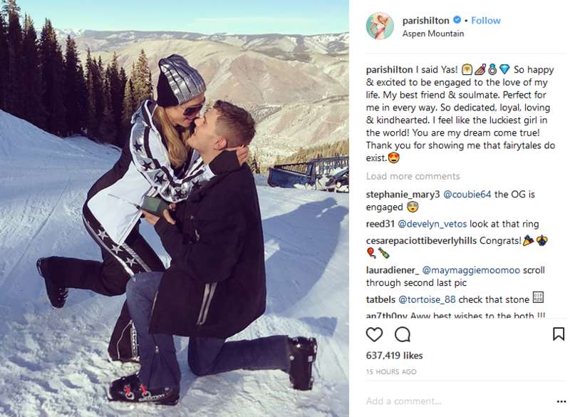 Мужчина сделел предложение своей возлюбленной на горнолыжном курорте в Аспене, куда они отправились на каникулы. Снимками поделилась сама Пэрис на своей страничке в instagram.