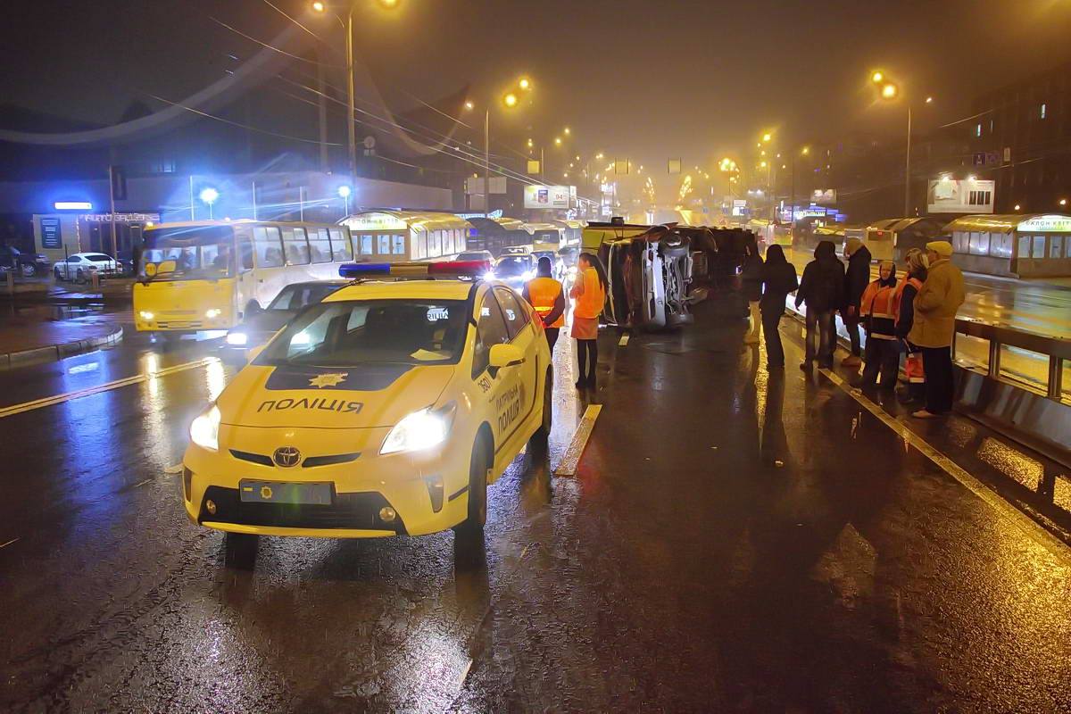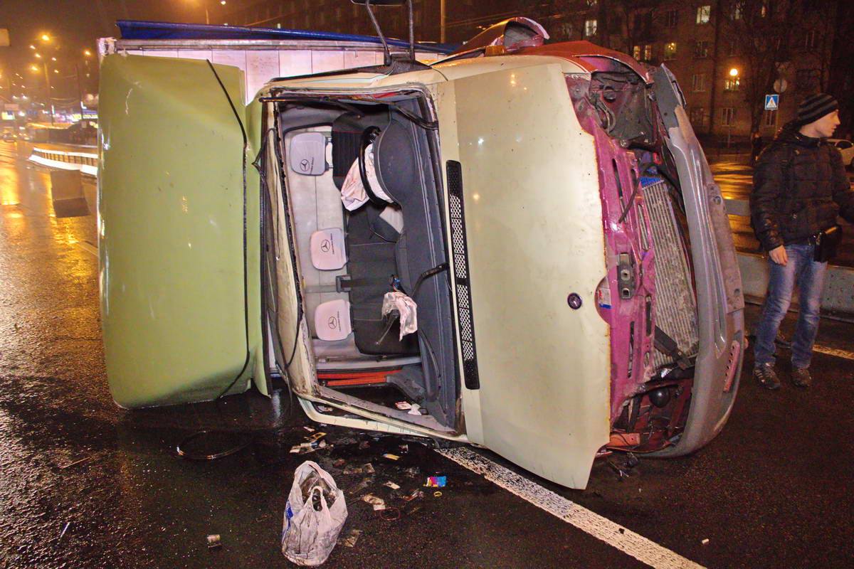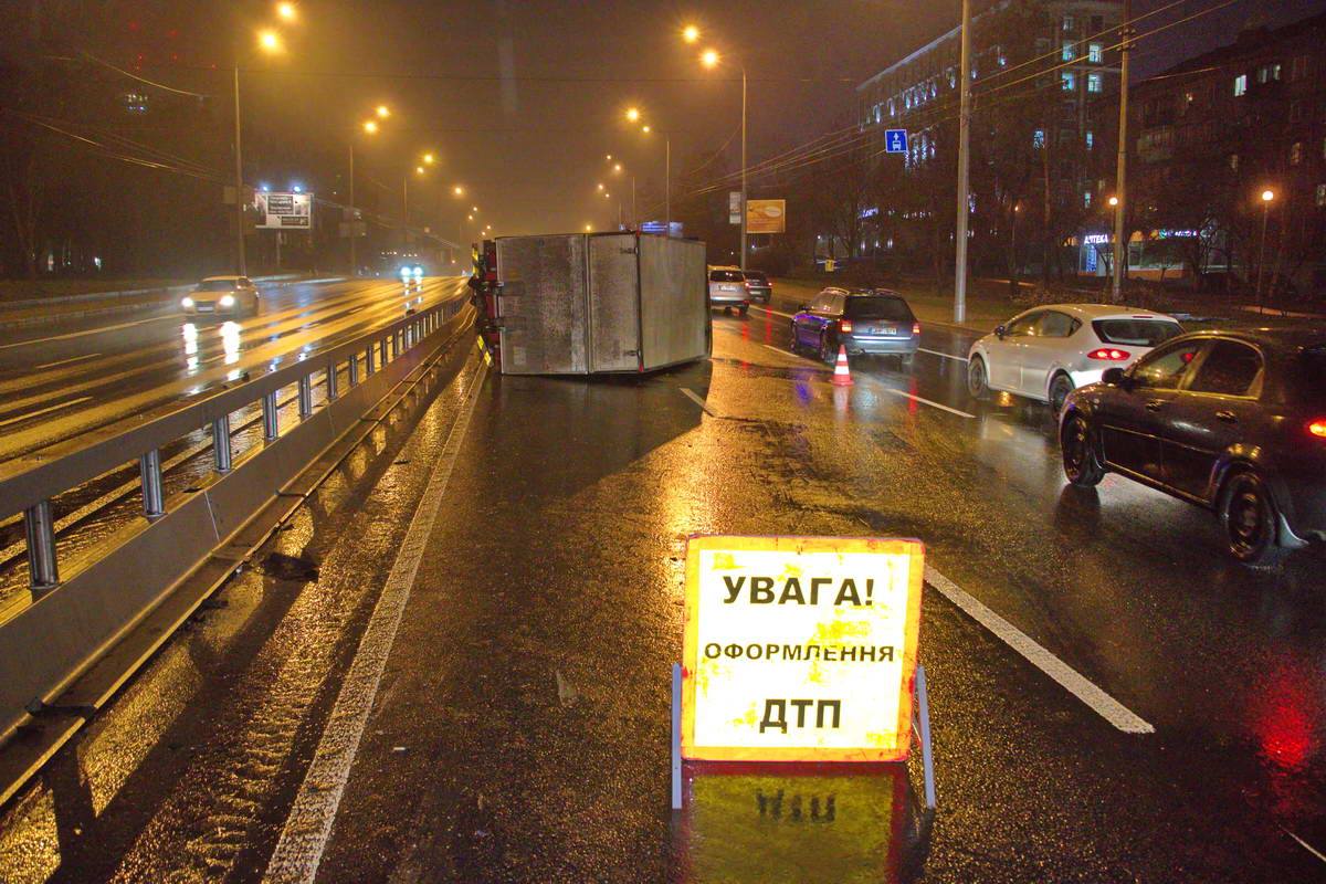 В Киеве посреди бульвара Дружбы народов перевернулся грузовик: водитель выбивал стекло, чтобы выбраться